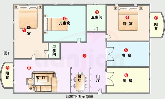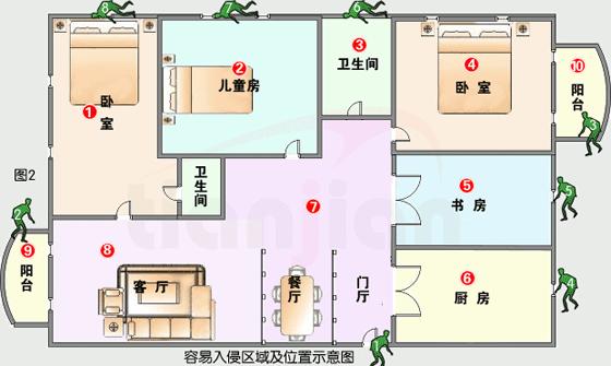 從圖1中,我們可以看出,2個陽臺和大門處于最容易受到入侵的位置;其次就是廚房、書房的窗戶(由于書房和廚房在平時一般是無人狀態,特別是晚上一般空置,容易成為竊賊的入口);再次就是主臥室①、兒童房②和衛生間③;