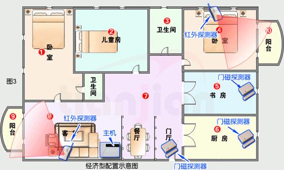 在上面經濟型配置的基礎上,在兒童房、客廳、書房加裝紅外探測器各1個,在衛生間的窗戶加裝門磁1個,這樣,我們就完成了一個基本的家庭防盜系統,同時在關鍵的防區(大門、書房)安裝了雙重探測設備。 設備如下: