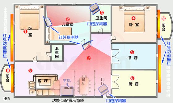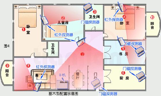 在清楚容易受到入侵的位置和區域后,應該根據你的周邊環境、小區保安措施、家庭環境等因素以及你的經濟情況決定設防的點數(當然是對所有的容易入侵防區全部設防最好)。在此,我們暫時以對以上區域全部設防為例,進行各種不同的防盜設備配置,您可以根據您的具體情況增減相關設備: