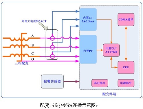 配變監(jiān)控終端——安裝于電線桿、配電房等需要進(jìn)行配變及線路監(jiān)控的場合。終端內(nèi)置PT、CT、計(jì)量模塊、通訊模塊、防盜信號(hào)處理模塊、CPU等部件,可以完成對(duì)配變或線路的電壓、電流等電力參數(shù)的采集,可以對(duì)外部如振動(dòng)、紅外探測等防盜信號(hào)進(jìn)行處理。